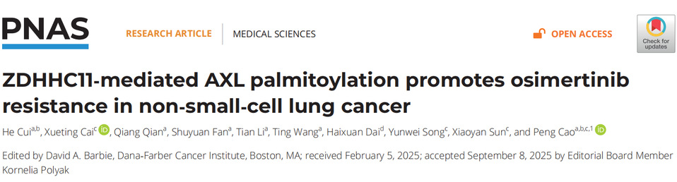 2025年10月28日,南京中医药大学曹鹏研究员团队在美国国家科学院院刊《PNAS》上在线发表题为:“ZDHHC11-mediated AXL palmitoylation promotes osimertinib resistance in non-small-cell lung cancer”的研究论文(direct submission)。该研究聚焦棕榈酰化修饰在非小细胞肺癌奥希替尼治疗抵抗上的调控机制,为后续临床转化研究提供理论依据。
