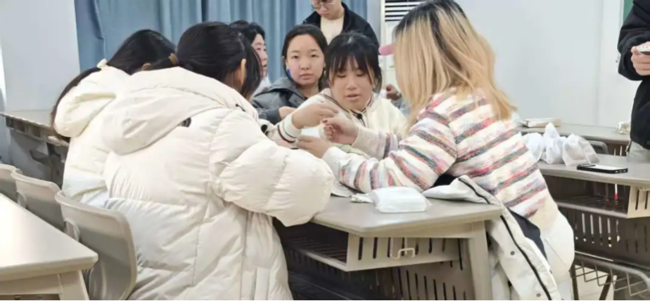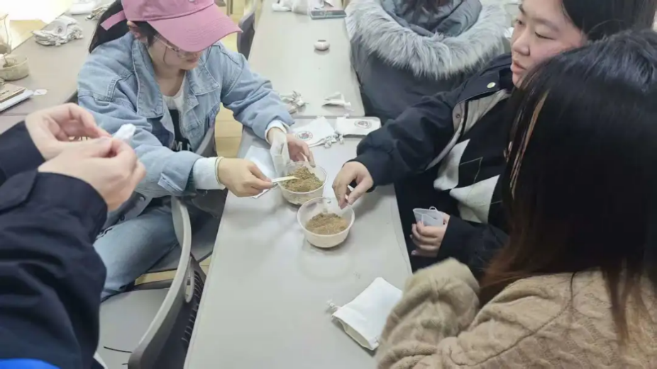 活动前期,中药23级1班与中药资源23级1班团支部同学们在教工党支部书记胡杨老师的指导下,精心选购了艾叶、薄荷等中药材,并采购了半成品材料。大家亲手将药材研磨分装,制成具有安神、驱蚊功效的传统香囊;同时,巧妙地将中药元素融入时尚设计,加工制作出一批兼具香气与美感的香珠手串和手工发卡。每一件作品都融入了中药材的清香与功效,从配料分装到成品整理,同学们在细致工作中深化了对中医药文化的理解,也为后续的爱心义卖做好了扎实而温暖的准备。