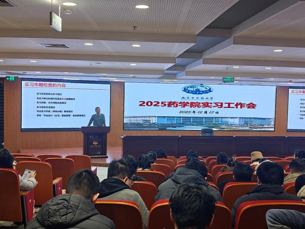 2025年12月17日,药学院召开2026届本科生毕业实习安全教育及论文指导会议,全体2026届本科毕业实习生通过线下与线上相结合的方式参加会议。此次会议旨在为即将进入实习阶段的同学们提供全面安全教育以及全方位实习指导,为即将踏上实习工作岗位奠定坚实的基础。