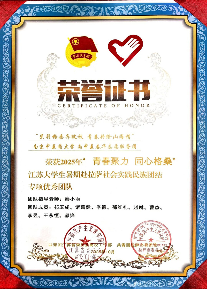 近日,由共青团拉萨市委、拉萨市青年志愿者协会联合共青团江苏省委高校部开展的“青春聚力,同心格桑”江苏大学生暑期社会实践民族团结专项活动评选结果揭晓。南京中医药大学药学院“春华志愿服务团”成功入选江苏大学生暑期赴拉萨社会实践民族团结专项活动,并荣获优秀团队称号。