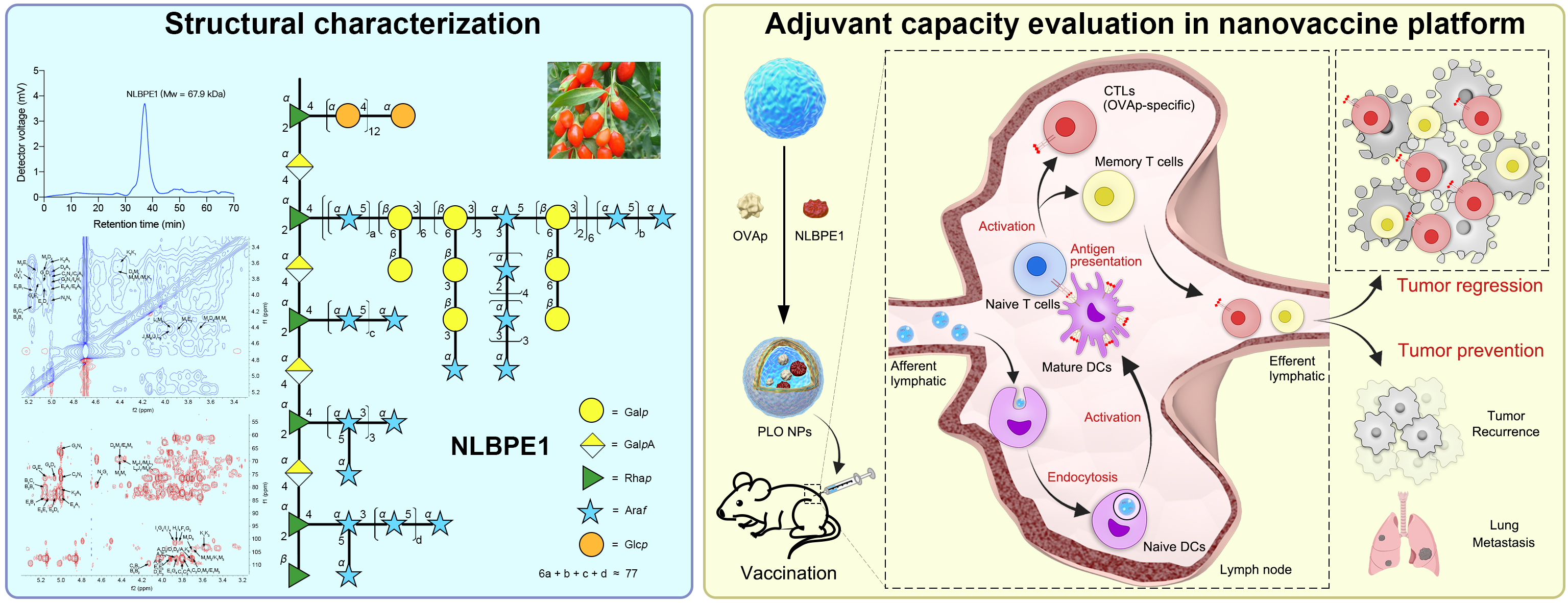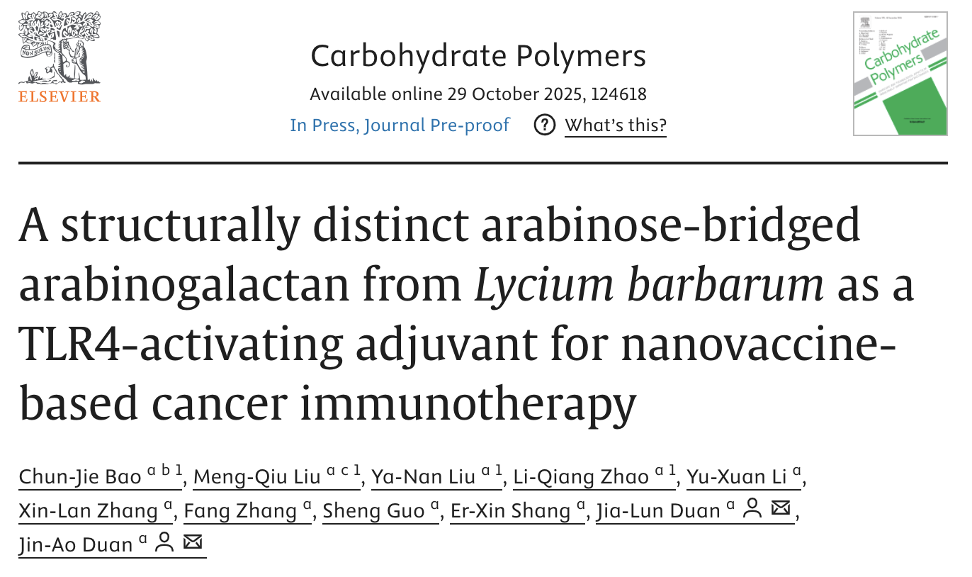10月29日,我校江苏省中药资源产业化过程协同创新中心段金廒教授/段嘉伦副教授团队在国际学术期刊Carbohydrate Polymers(中科院一区,IF:12.5)期刊上在线发表了题为A structurally distinct arabinose-bridged arabinogalactan from Lycium barbarum as a TLR4-activating adjuvant for nanovaccine-based cancer immunotherapy的研究工作。该研究首次从枸杞子中分离并解析了一种均一化多糖NLBPE1,揭示了其作为疫苗佐剂在肿瘤免疫治疗中的应用潜力。