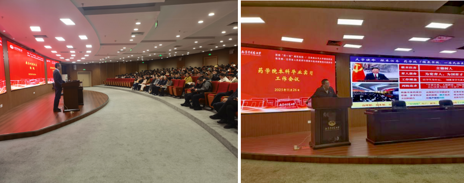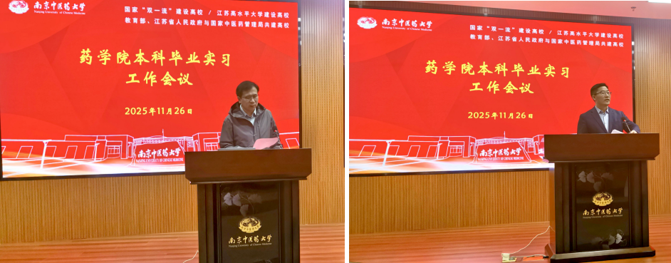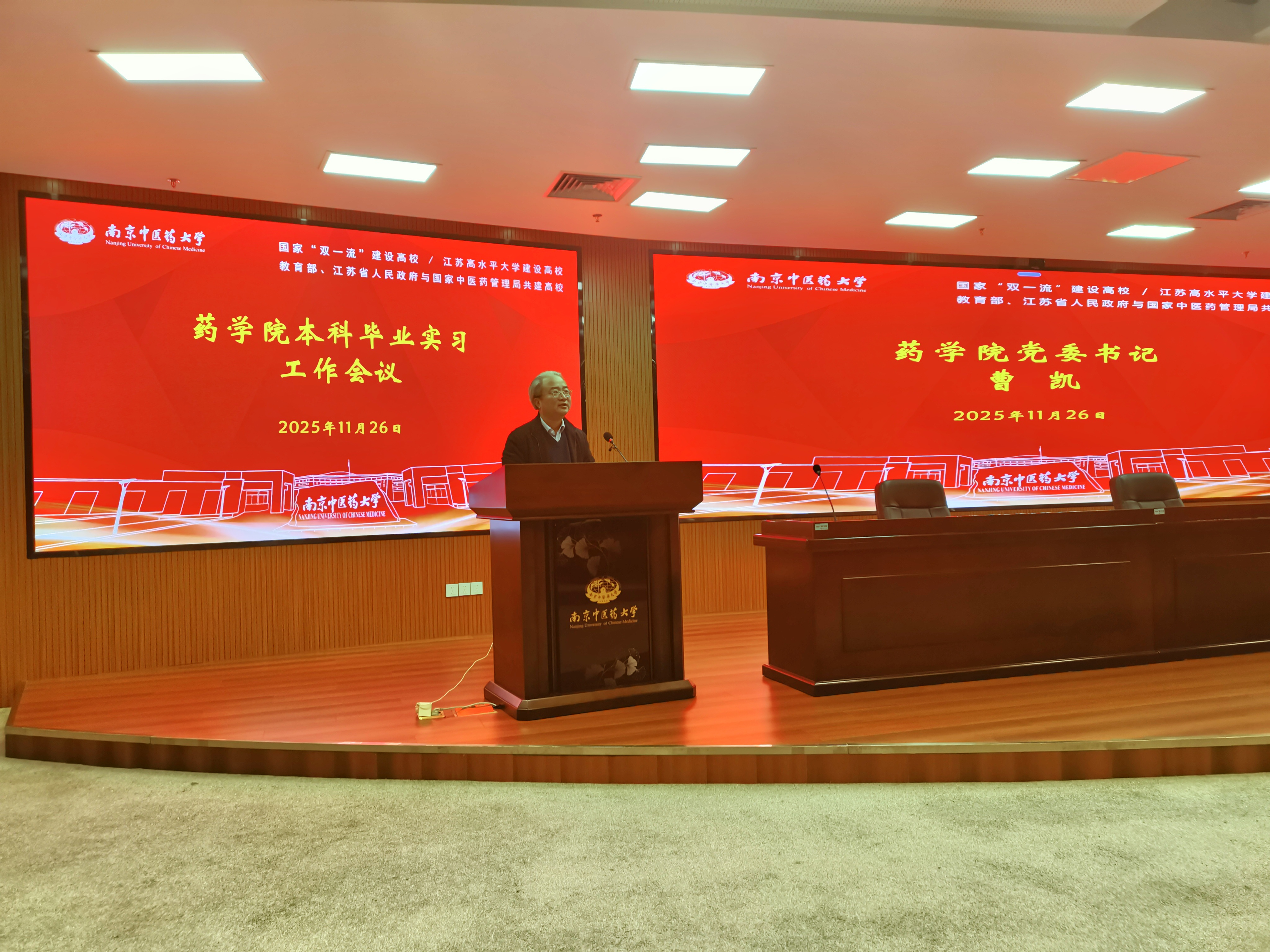 11月26日,药学院成功召开2025年本科毕业实习工作会,此次会议旨在为即将步入实习岗位的2026届毕业生提供全面指导,助力他们顺利开启实习生涯。来自各附属中医院、食品药品监督检验院、中医药研究所、药品生产企业共25家实习单位的代表参加会议。南京中医药大学教务处副处长杨帆、药学院党委书记曹凯、执行院长赵明、副书记、副院长马新飞、副院长李念光,以及药学院各专业负责人、相关教研室主任、全体毕业班辅导员、班主任出席会议。全体毕业生以线下和线上两种方式参会。会议由药学院副院长李念光主持。