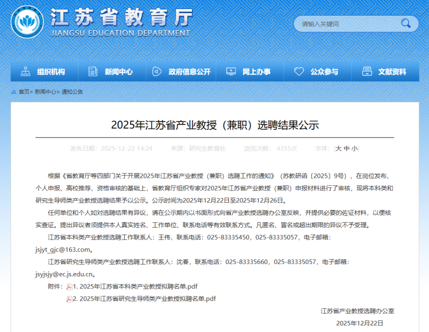 近日,江苏省教育厅、省委人才办、省科技厅、省人力资源和社会保障厅联合发布了《省教育厅等四部门关于公布2025年江苏省产业教授(兼职)选聘名单的通知》(苏教研函〔2025〕9号)。此次选聘中,我院获批3位江苏省研究生导师类产业教授。此次入选,是我院持续深化产教融合的又一标志性成果。