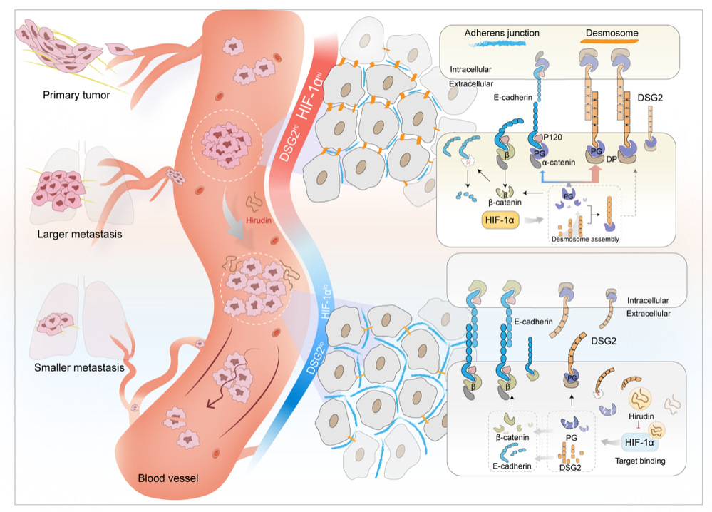 2025年12月12日,陆茵、陈文星教授团队在《Experimental & Molecular Medicine》(中科院一区Top/JCRQ1,IF:12.9)期刊在线发表了关于破血中药水蛭活性成分水蛭素抑制肿瘤血行转移的最新研究论文。论文标题为“Hirudin suppresses hematogenous metastasis by targeting desmosome junction transition in circulating tumor cell clusters via HIF-1α-DSG2 signaling”。