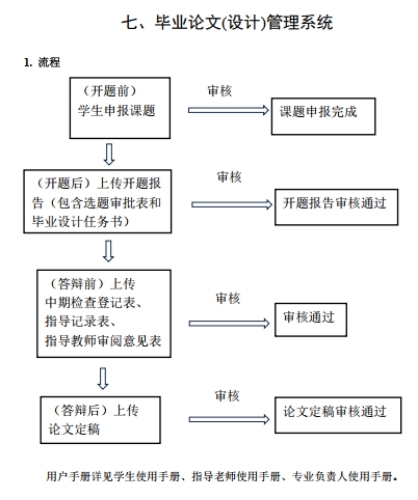 毕业论文(设计)管理系统流程如下图,详见实习管理手册P96页。具体使用方法课参考毕业设计(论文)管理系统使用指南(附件4)