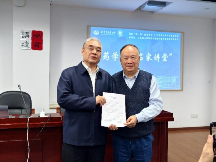 3月28日,药学院“名家讲堂”在图书馆309顺利举行。本次讲座由药学院麻彤辉院长主持,邀请到三位中医药领域权威专家,围绕中药创新研发、理论机制与学科发展展开深度分享,为全院百余名师生带来一场学术盛宴。活动伊始,《中草药》执行主编陈常青研究员向南京中医药大学段金廒教授授予约稿函,为后续学术交流与成果传播搭建了良好桥梁。